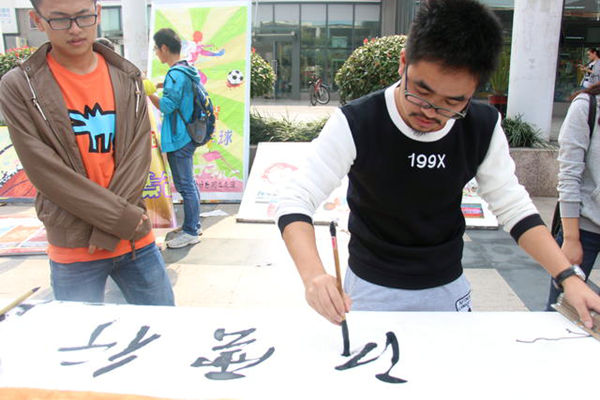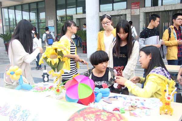 灵心居手工社则展示了各类手工作品,由珠子串成的可爱小狗、漂亮玫瑰以及纸质的向日葵、绣球等无不彰显手工社成员的心灵手巧。协会成员还现场用气球扎出小狗送予体验者。国画背景的展板别出心裁,翰墨轩现场书写字幅赠与在场同学。“以前就对书法感兴趣,一直想加入翰墨轩,但由于各种原因一直没能加入,这次我又过来了。”合肥学院2013级外语系学生乐蓉蓉对记者说道。