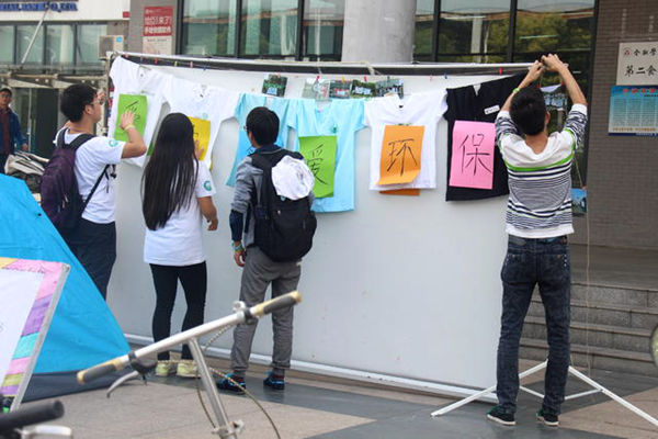 大学生环保协会通过提供空白环保袋,邀请学生们手工绘制图案,画出自己心中的环保理念,吸引了众多学生的目光。学生画好后环保袋,可自行带回使用,减少一次性购物袋的使用。而由6件各异的文化衫制成的环保绿色横幅更令人倍感新鲜。据了解,这些文化衫均是与外校环保协会合作交流后外校所赠。同学们在写有“爱生活,爱环保”字样的卡片上留下了的签名。与此同时,环协还展示了往届废物利用工艺作品以及环保创意大赛获奖作品。“我在皖南医学院祝合肥学院大学生环保协会招新成功,在环保路上一路同行,越走越远,共圆美好梦想……”由重庆大学、四川大学、新华学院等19所省内外高校共同参与录制的祝福的话语同时在现场播放。