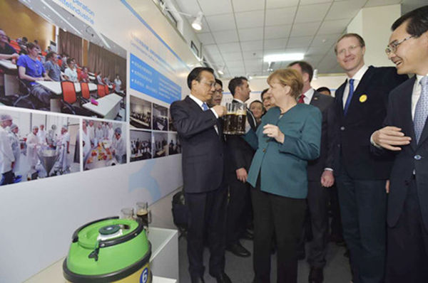 30日上午,李克强总理与德国总理默克尔在合肥学院食品专业交流合作展区共同品尝我校学生酿制的德国黑啤。(中国新闻网 人民网消息)
