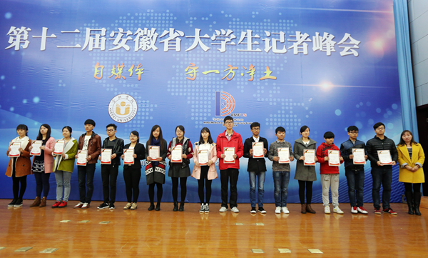 随后,2015年安徽省校园十佳新闻记者、2015年度安徽省高校校园“好新闻奖”获得者、峰会“自媒体 守一方净土”主题征文比赛获奖名单公布。主题征文获奖代表、2015年度安徽青年报《大学生周刊》“十佳”学生记者和 “十佳”学生记者站依次上台领奖。校园“好新闻奖”通讯类一等奖获得者安徽农业大学姚安琪和消息类一等奖获得者安徽师范大学皖江学院李玲玲分别上台发表讲话。