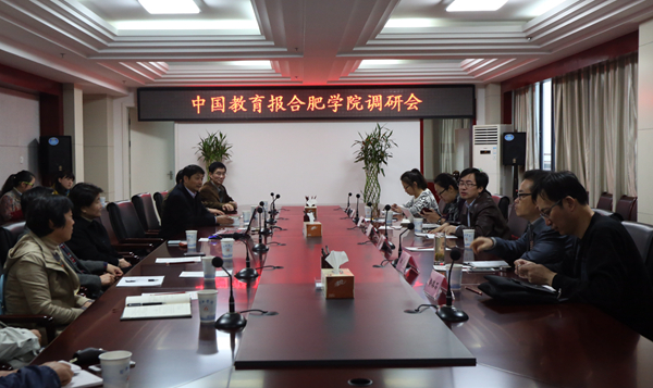 11月18日,中国教育报副总编张显峰、编委储召生、新闻中心副主任柴葳、安徽记者站副站长俞路石等一行来我校调研地方应用型高校转型发展工作,安徽省教育厅高等教育处处长储常连陪同考察。我校党委副书记、校长张文兵热情接待了张显峰一行,对中国教育报、安徽省教育厅对学校的支持表示感谢,并介绍了学校转型发展情况。