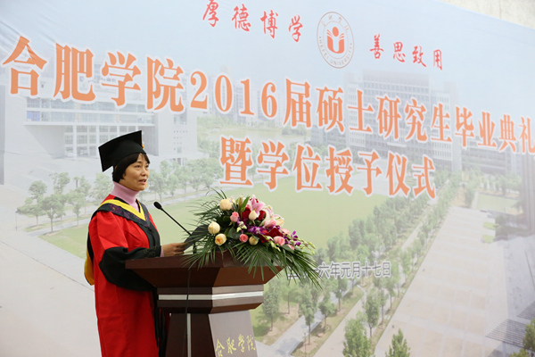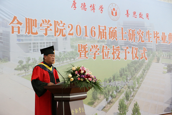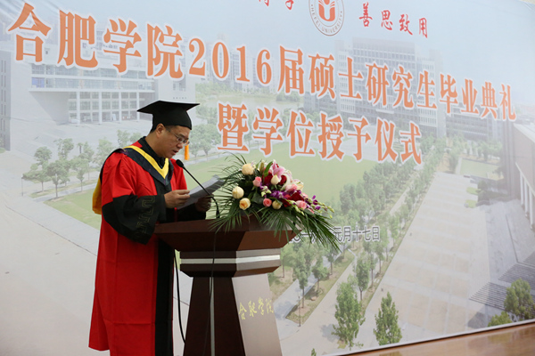 毕业典礼在庄严的国歌声中开始。合肥学院硕士研究生学位评定委员会委员、校党委副书记丁明教授首先宣读了合肥学院硕士研究生学位评定委员会“关于授予2016届环境工程专业徐芳丽等29名研究生工程硕士学位的决定”和 “关于表彰合肥学院2016届环境工程专业硕士研究生科研成果奖、优秀毕业生、优秀毕业论文和‘合大环保奖学金’获得者的决定”。