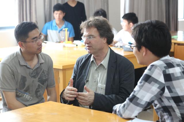 会后,诺贝尔特.拜恩哈德参加电子系答辩会,并向电子系学生详细介绍光伏这一专业。(学生记者 张俐 罗欢)