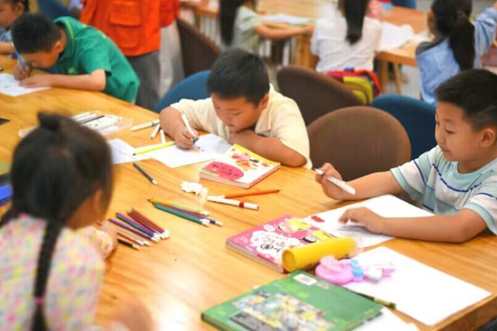 七彩假期,不仅仅局限于传播课堂知识,更要以美育人、以文化人,提高学生审美能力和人文素养。依托于“悦书房”的教学地点,小朋友们天马行空的想象力得到了充分的展示。五彩斑斓的颜色绽放于画作上,一颗颗美育的种子也埋进了小朋友们的心里。志愿者充分尊重学生的个性差异,以多样化的教学方式引起学生的鉴赏兴趣,带领小朋友们欣赏经典曲目《梁祝》《致爱丽丝》等。从美术到音乐,从课堂到生活,或浅或深的感悟留在每个人的心中,又创造出新知。