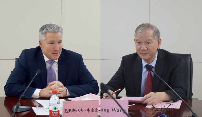 9月25日,我校举办安徽省高校与英国德比大学合作推进会。德比大学副校长克里斯托夫·大卫·布塞尔(Christopher David Bussell)率领德比大学代表团出席推进会并访问我校。省教育厅外事处处长姚德勇、安徽工程大学党委书记张志宏、安徽医科大学与安徽师范大学国际交流合作负责同志参会。党委书记王其东对代表团一行来访表示热烈欢迎,党委委员、宣传统战部部长贾峰主持会议。